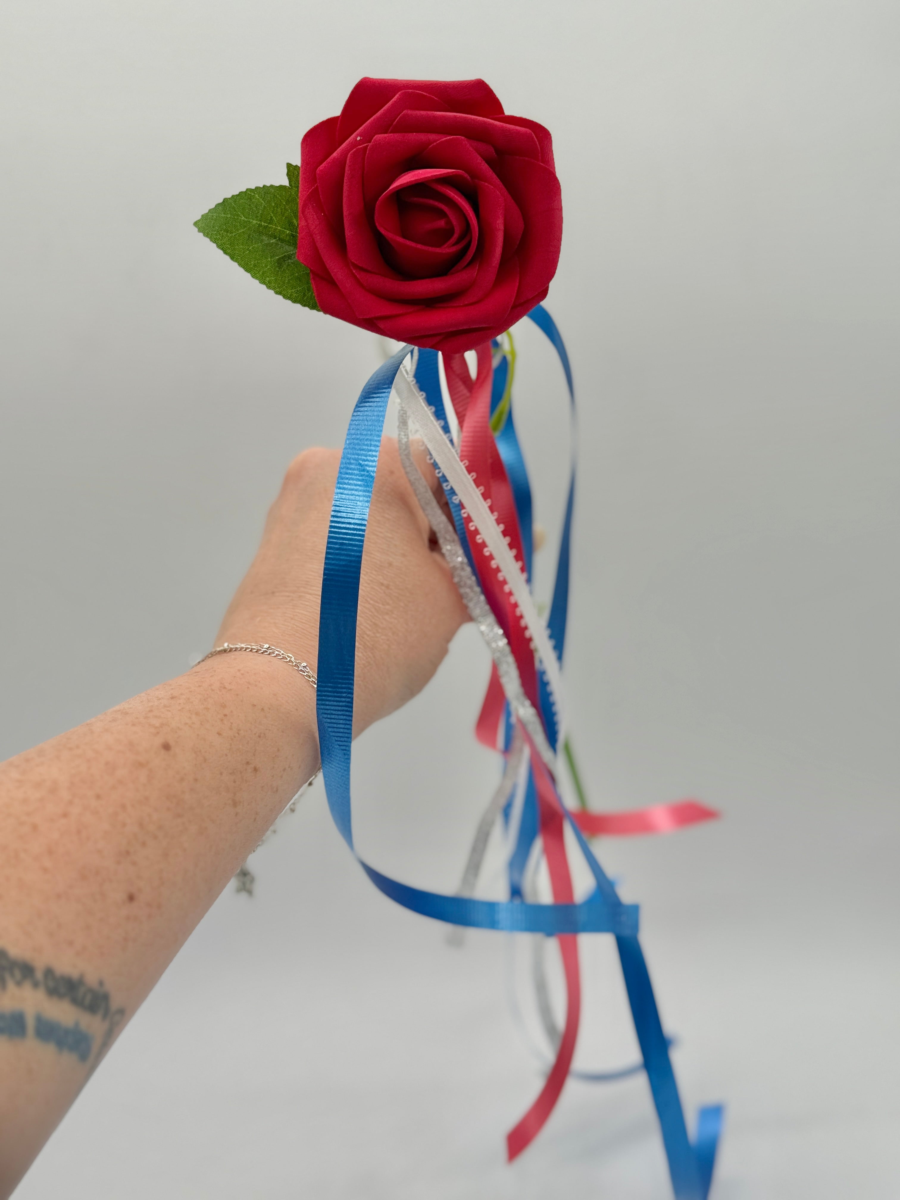 A foam flower with assorted ribbons on a stem, featuring team colors