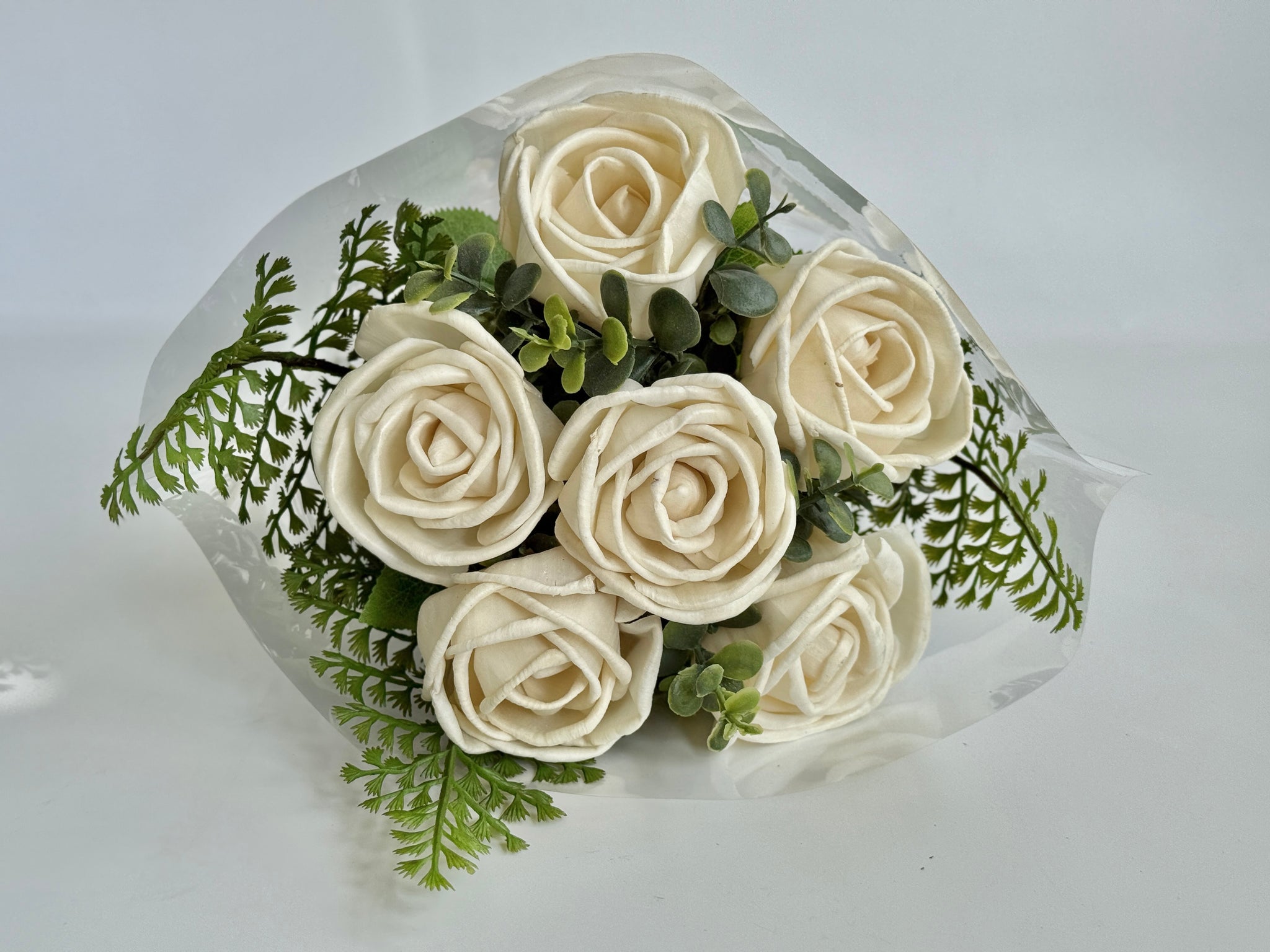 1/2 dozen white roses with mixed greenery (greenery may vary from photo).