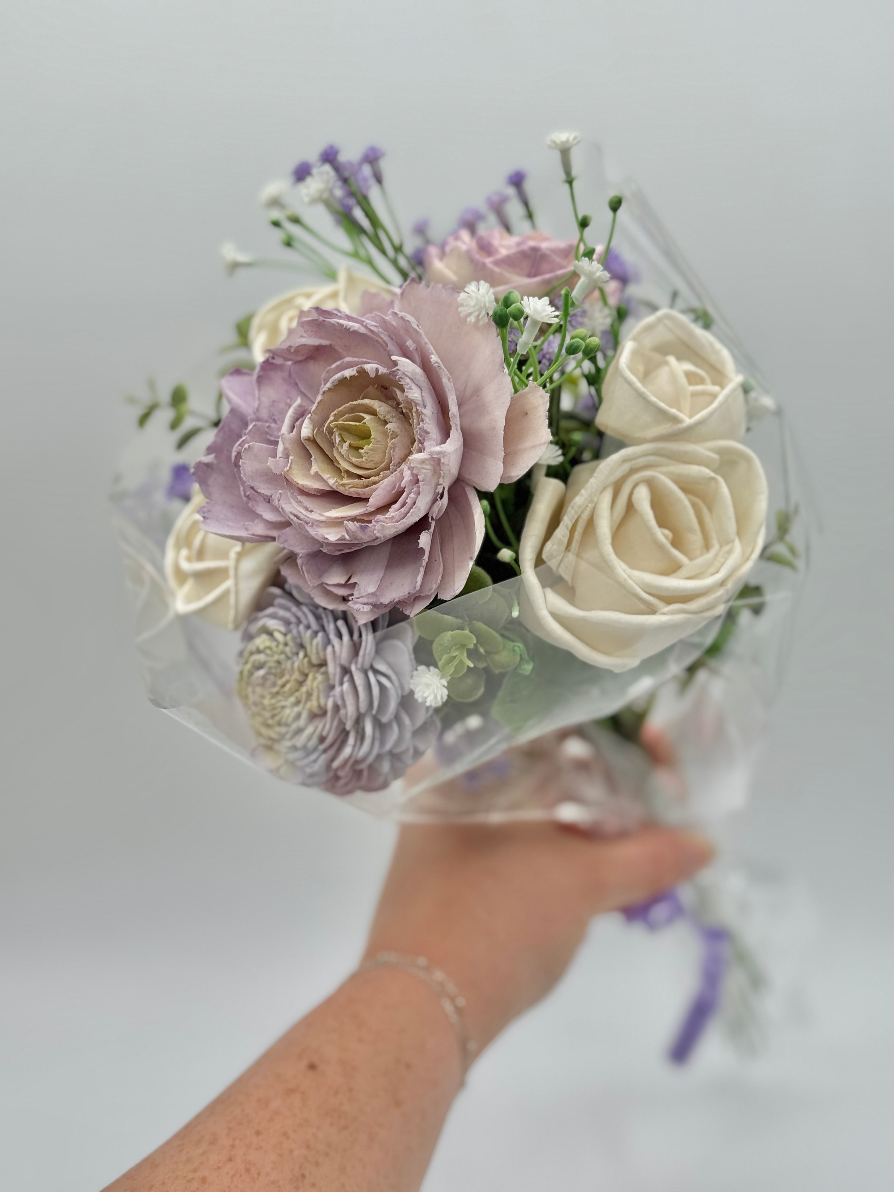 A medium bouquet made up of 6-8 flowers. soft purples and periwinkle