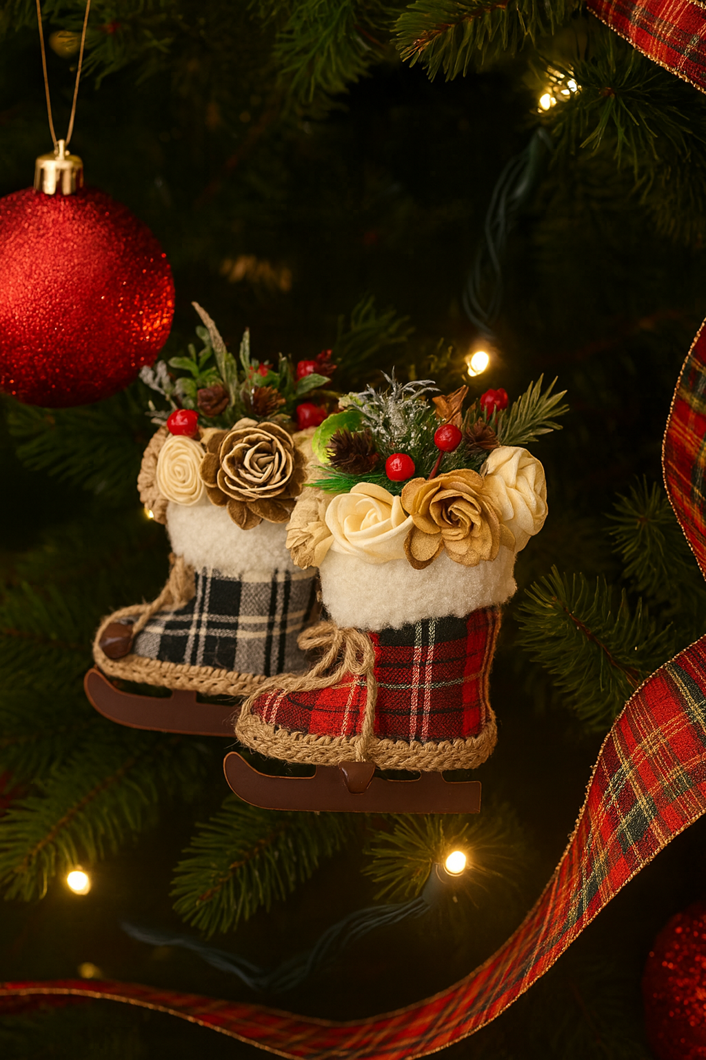 Black and white ice skate ornament with 6 wood flowers and coordinating greenery.