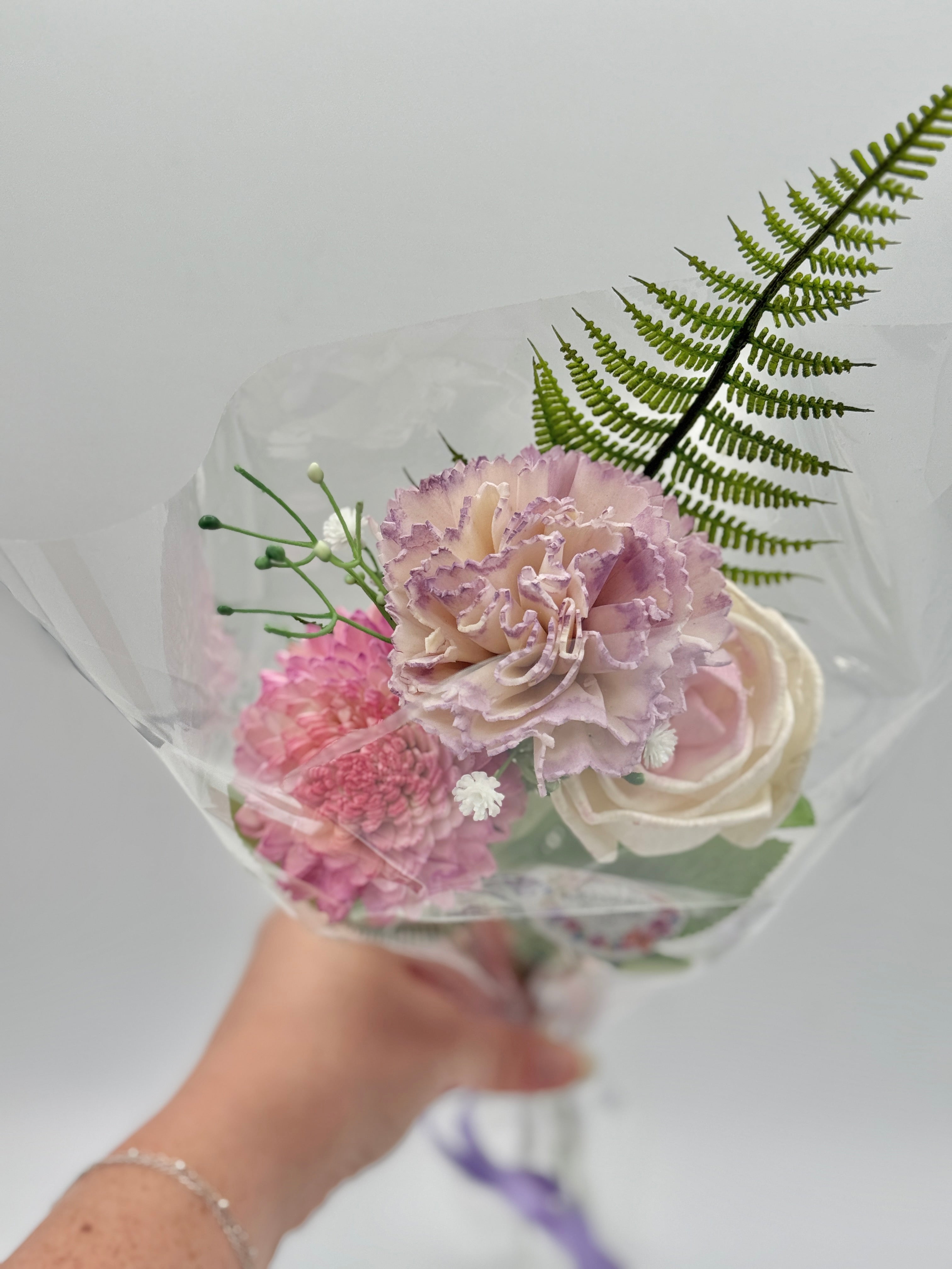 A small bouquet comprised of pink and purple flowers with assorted greenery