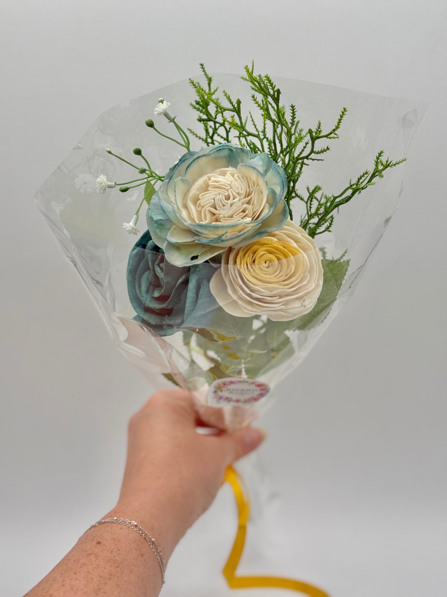 A small bouquet comprised of teal ans yellow flowers with assorted greenery