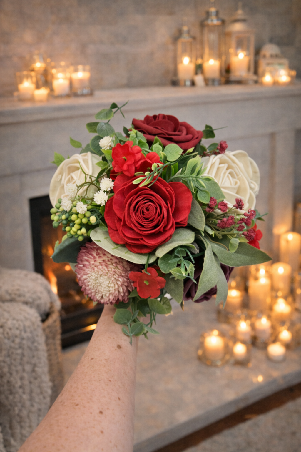 Choose your style: Romantic Red or Pretty Pink — both handcrafted with mixed medium bouquet of wood and foam flowers for a gift they’ll treasure long after February 14th.