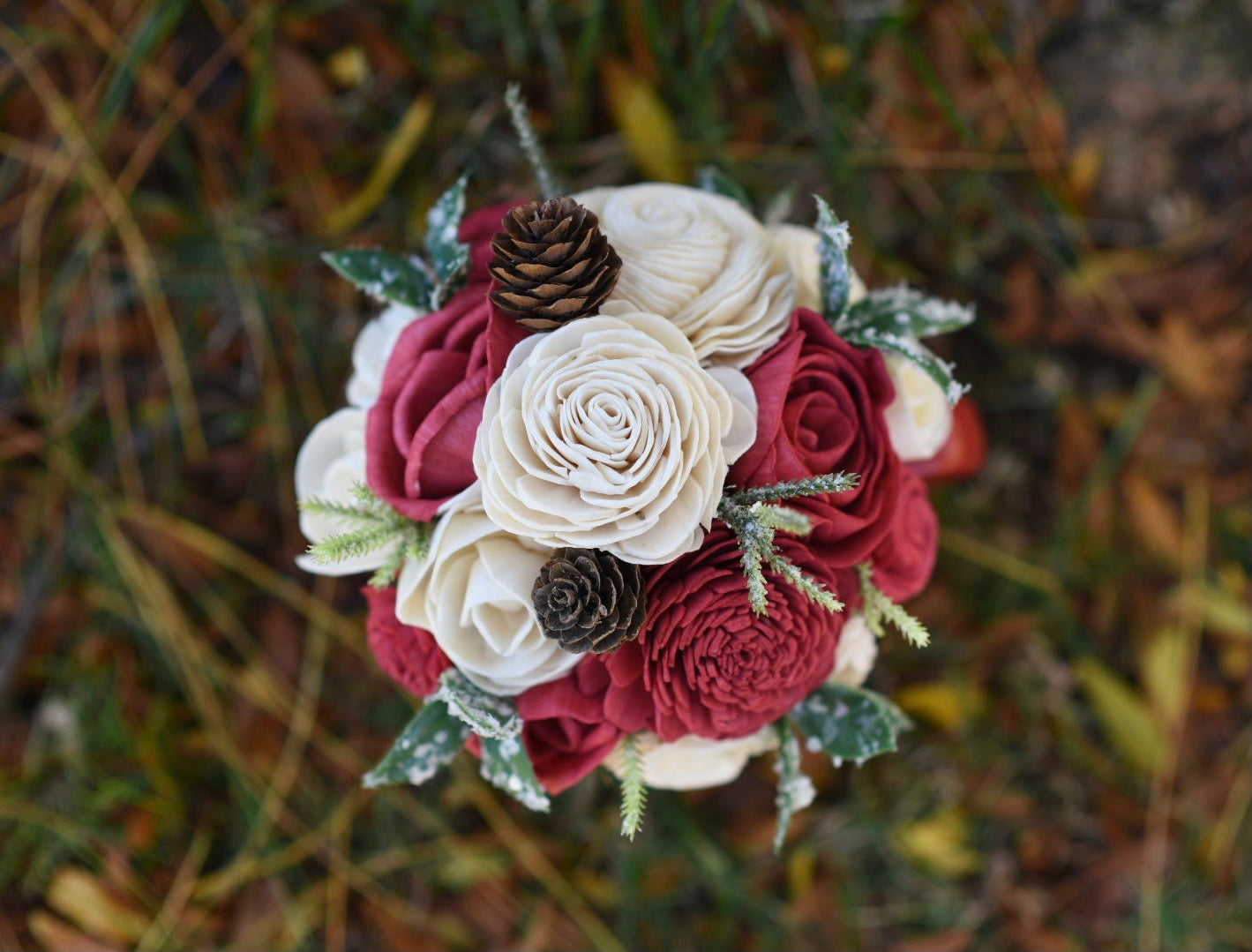 An oversized red mug with “Santa doesn’t believe in you either,” message. Arrangement is made up of red and natural flowers, winter berries, artificial greenery, and pine cones.