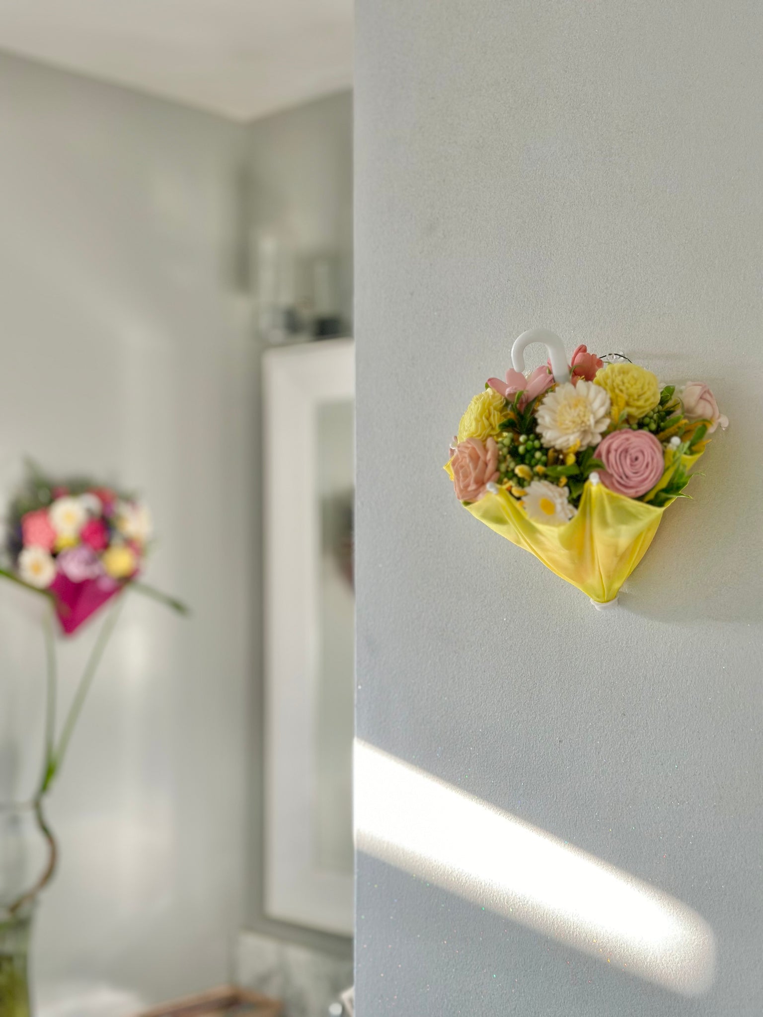 A bright mix of flowers nestled inside a mini umbrella backed with wire for hanging