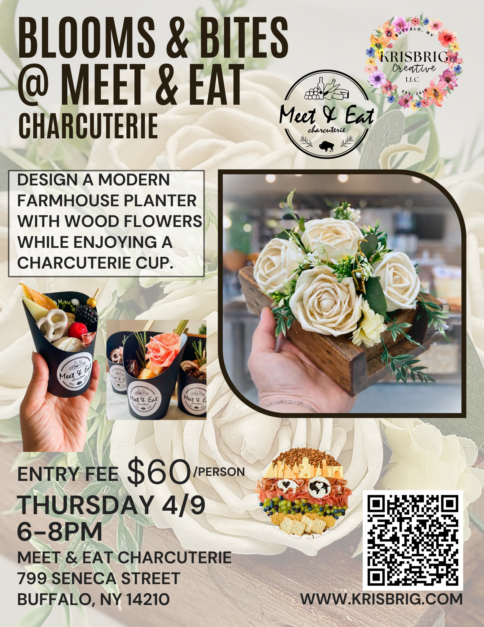 Join KrisBrig Creative at Meet & Eat Charcuterie in Buffalo for an evening of Blooms & Bites! You’ll design a modern farmhouse-inspired wood flower planter using premium wood flowers and greenery, and enjoy a delicious individual charcuterie cup while you create. No experience needed — we’ll guide you step-by-step. Perfect for a date night, friends night out, or a treat-yourself evening.