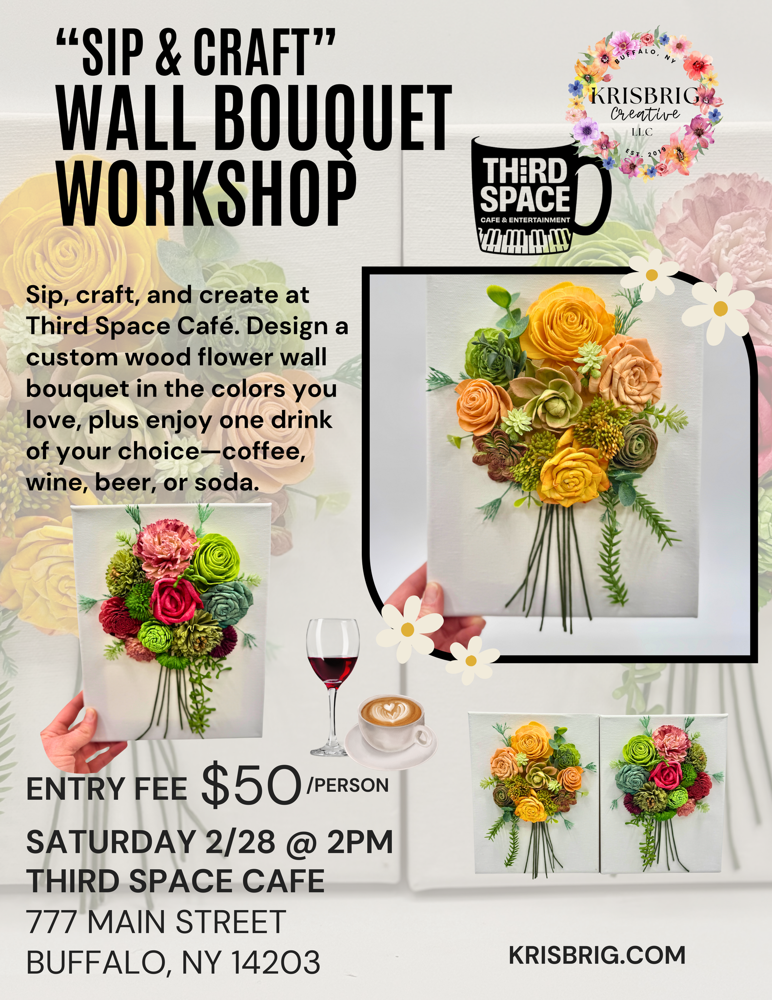 Grab a drink, pick your colors, and get crafty! Join KrisBrig Creative at Third Space Café for a fun and relaxed sip & craft experience where you’ll create your own wood flower wall bouquet on canvas—no green thumb required.